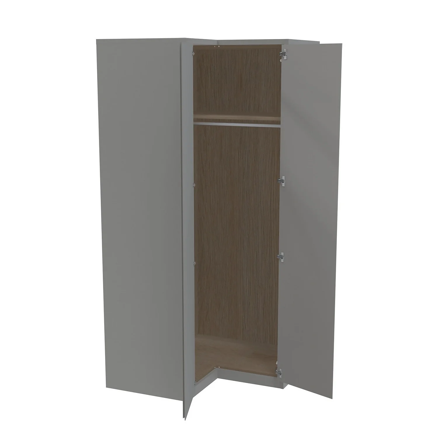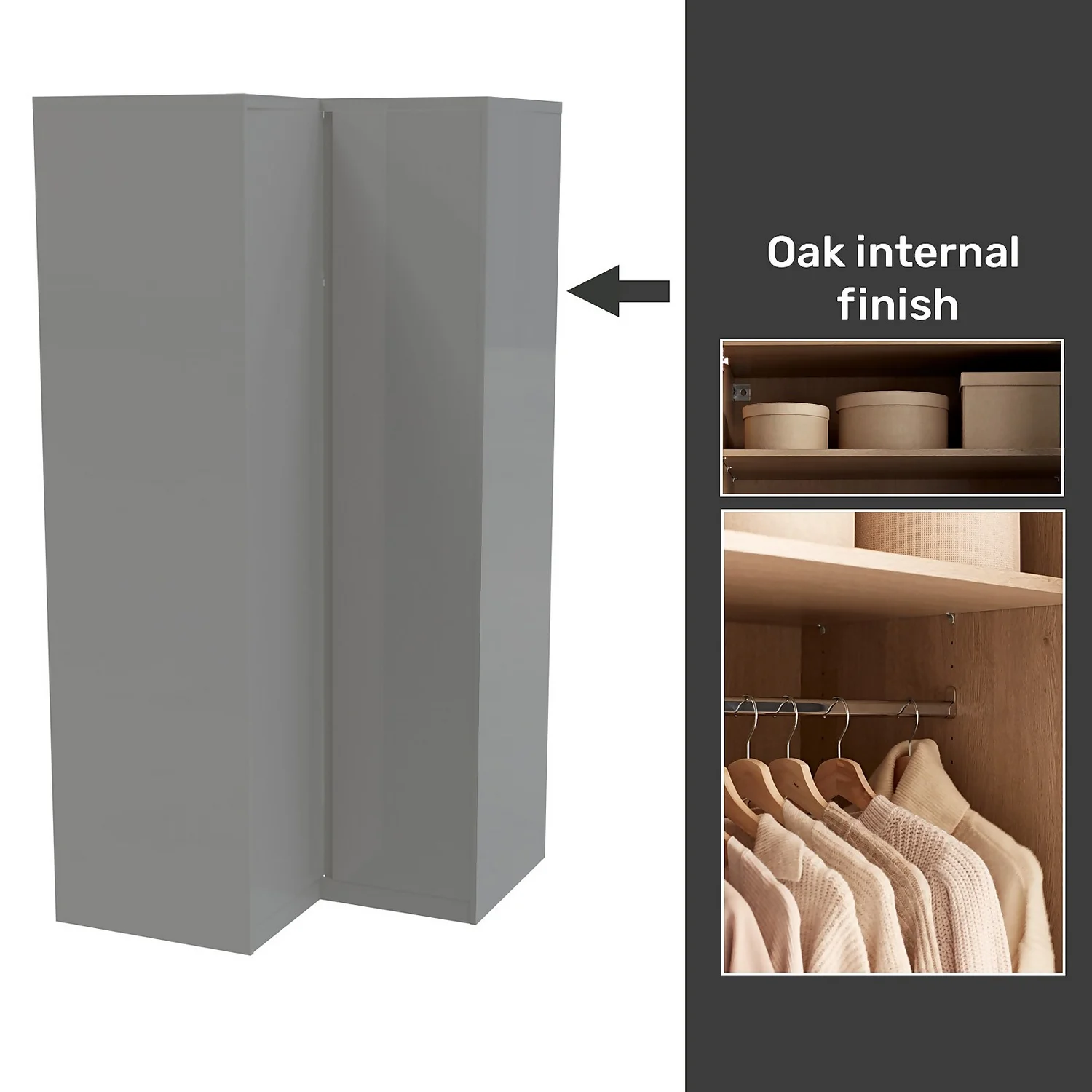 This corner wardrobe (1 x double unit and corner conversion) features an oak effect carcass and beautiful luxe gloss grey handleless doors. The wardrobe features premium soft close clip-on Blum hinges, five shelves and a hanging rail. You can customise your wardrobe with our additional internal storage options (available separately) including internal drawers, shelves, dividing shelves and extra hanging rails.