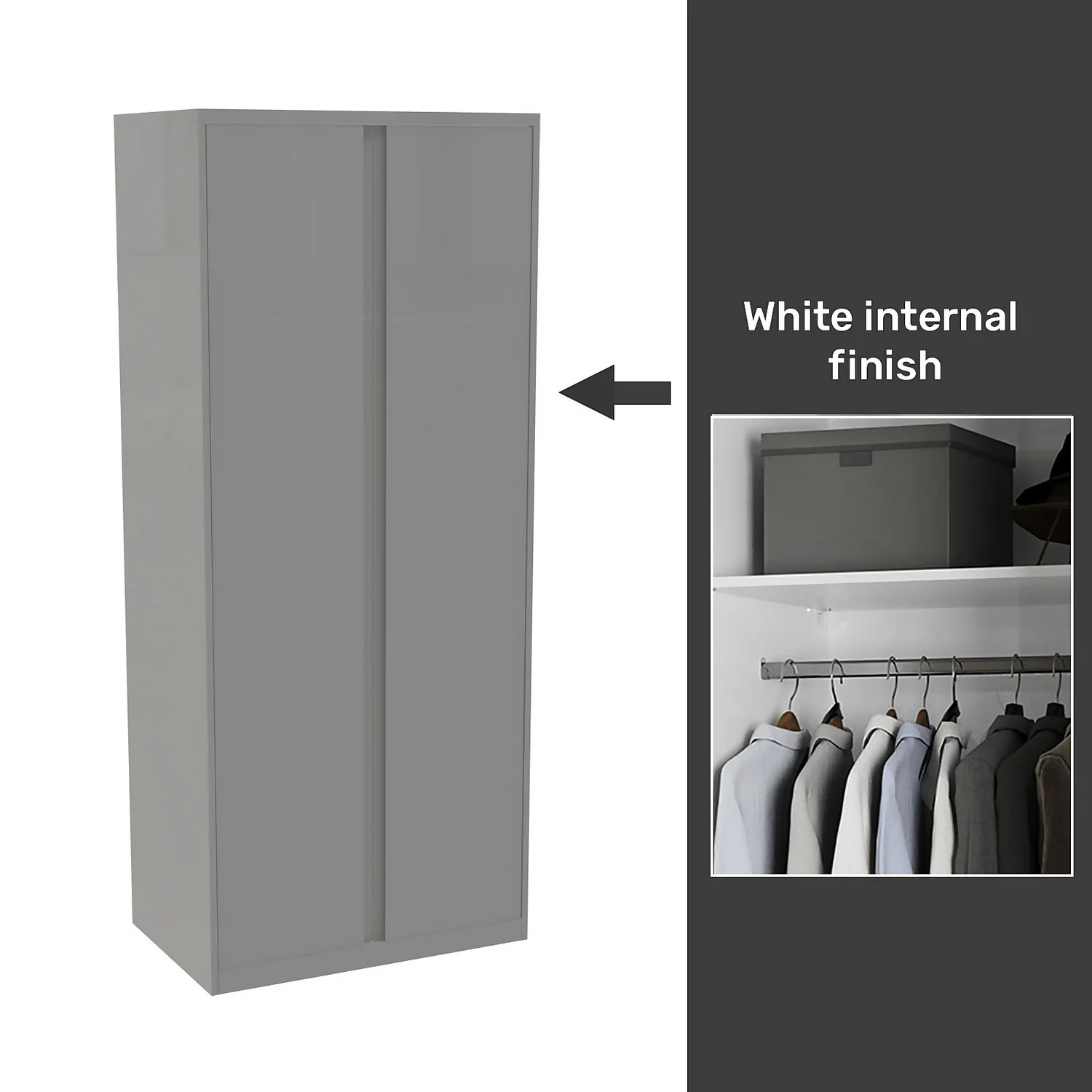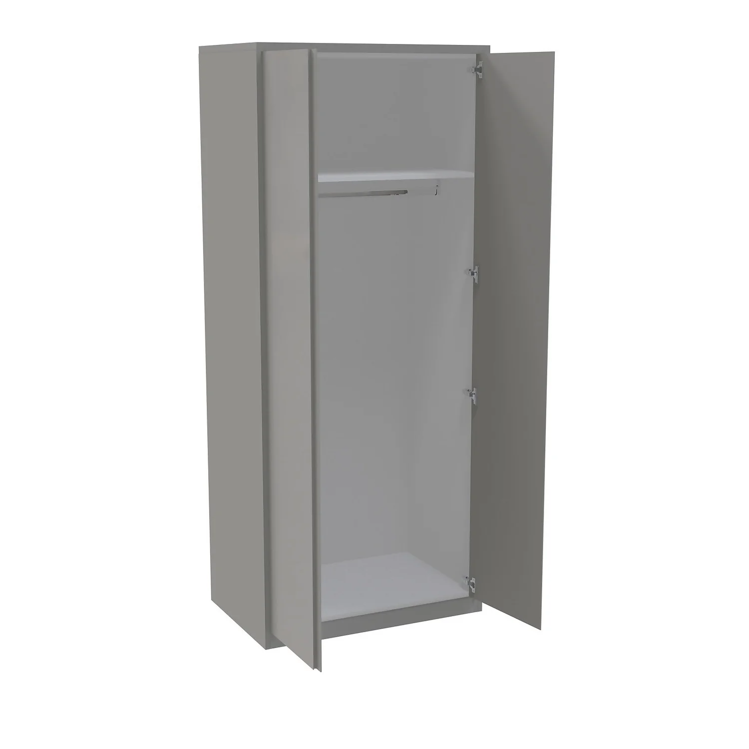 This double wardrobe features a white internal carcass which includes end panels, plinth and matching cornice all in a finish to match the beautiful luxe handleless gloss grey door. The wardrobe features premium soft close Blum hinges, a shelf and a hanging rail. You can customise your wardrobe with our additional internal storage options (available separately) including internal drawers, shelves, dividing shelves and extra hanging rails.