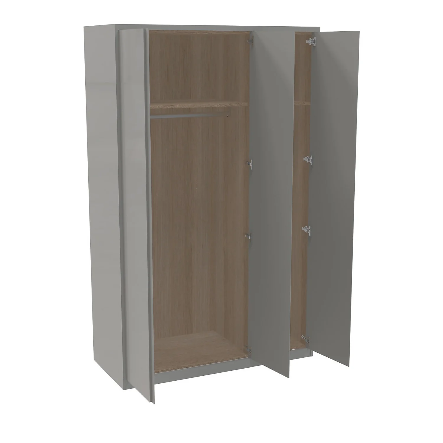 This triple wardrobe (1 x double unit and 1 x single unit) features an oak effect internal carcass and includes end panels, plinth and matching cornice all in a finish to match the beautiful luxe gloss grey handleless doors. The wardrobe features premium soft close clip-on Blum hinges, two shelves and two hanging rails. You can customise your wardrobe with our additional internal storage options (available separately) including internal drawers, shelves, dividing shelves and extra hanging rails.