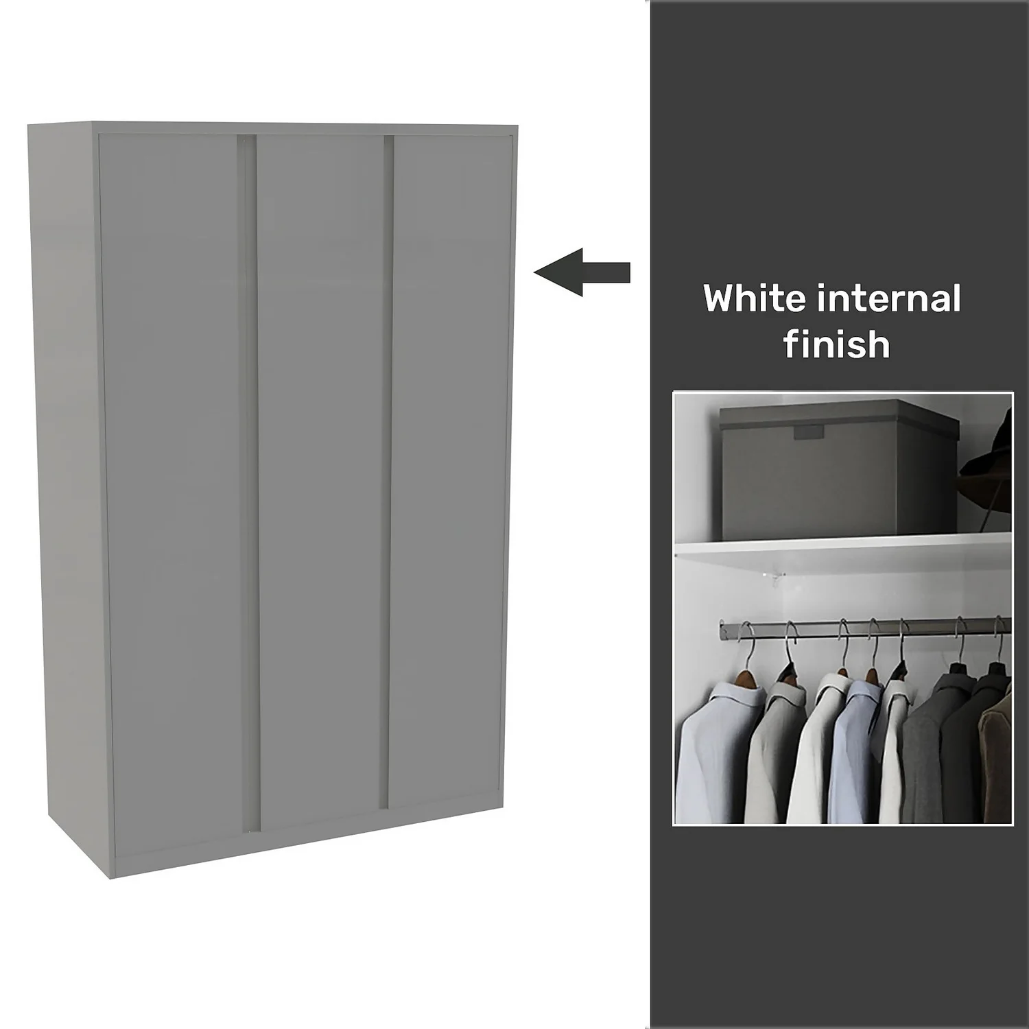 This triple wardrobe (1 x double unit and 1 x single unit) features a white internal carcass and includes end panels, plinth and matching cornice all in a finish to match the beautiful luxe gloss grey handleless doors. The wardrobe features premium soft close clip-on Blum hinges, two shelves and two hanging rails. You can customise your wardrobe with our additional internal storage options (available separately) including internal drawers, shelves, dividing shelves and extra hanging rails.