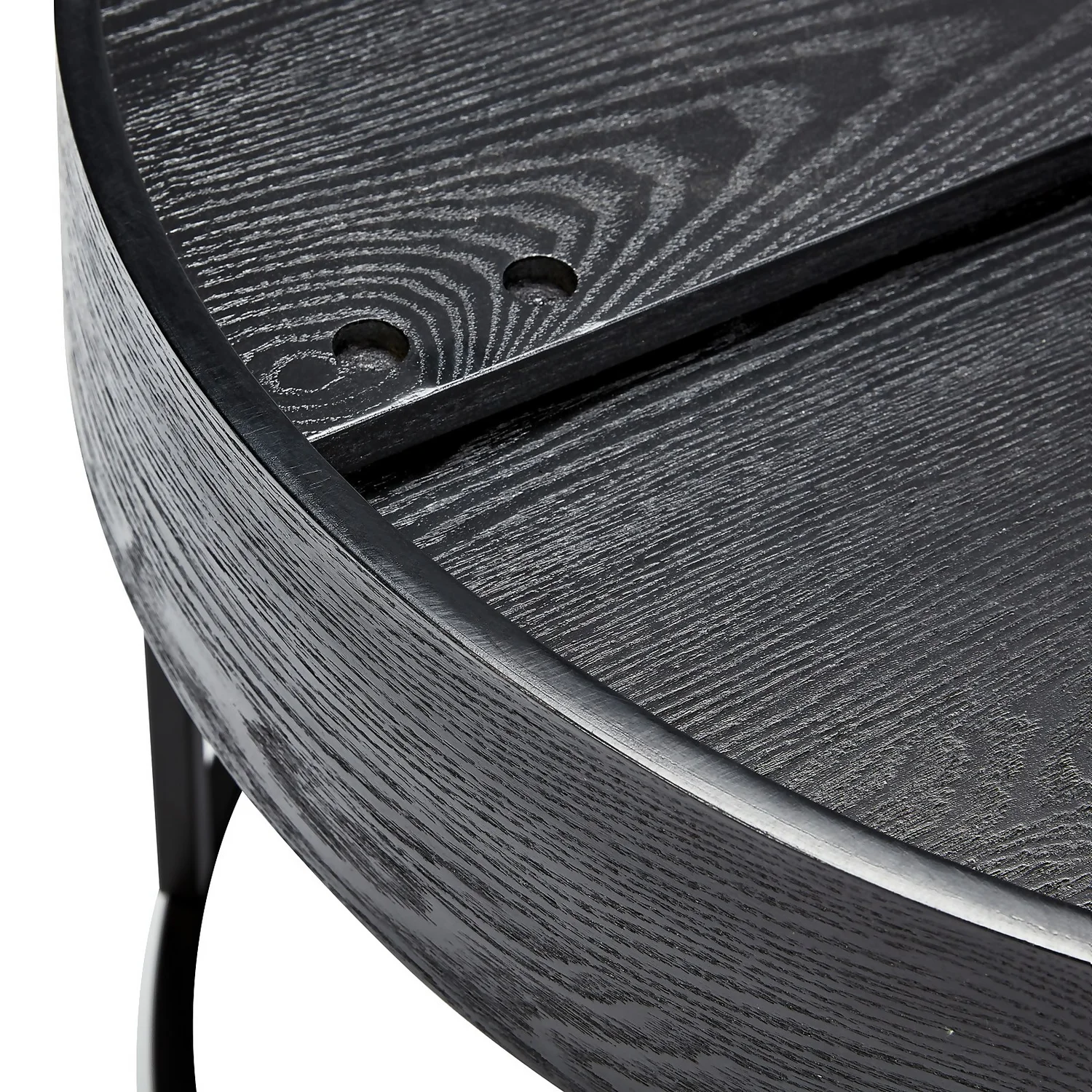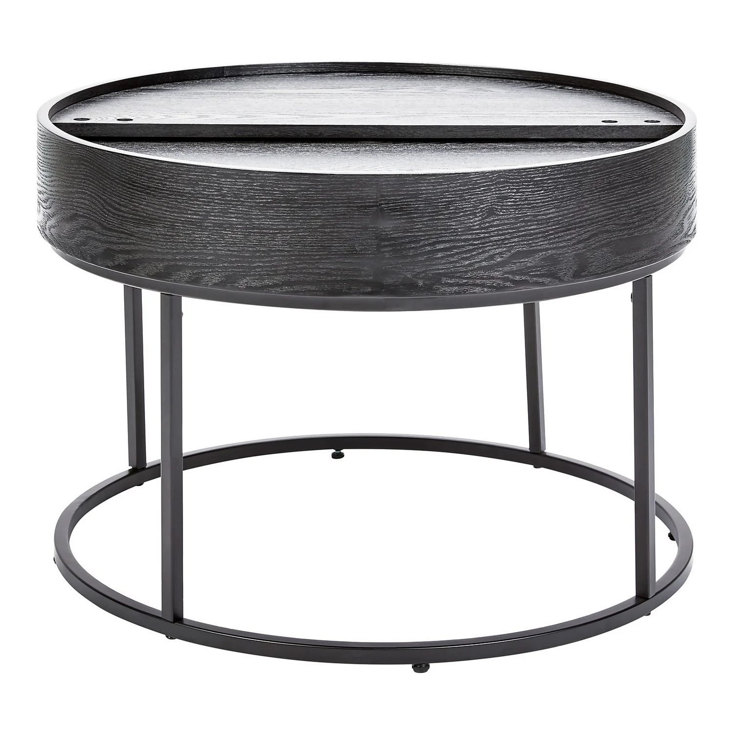The Halo black ash coffee table has a hidden storage space in the table top and an elegant black metal base.
