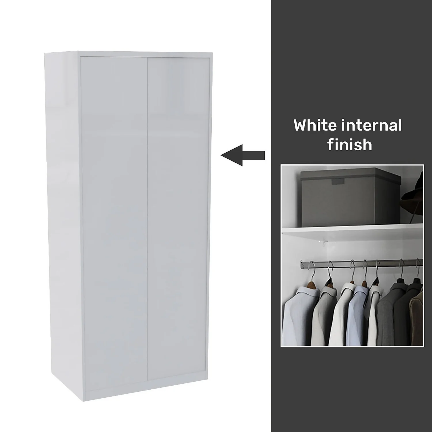The House Beautiful range is exclusive to Homebase and offers a selection of different finishes and storage configurations to suit your needs. With a range of carcass colours and contrasting door designs, you can select the look to fit your bedroom aesthetic. The House Beautiful range now includes the fully fitted look with this combination pack which includes the wardrobe, end panels, plinth and cornice, meaning you can complete your bedroom with a luxury look. Coordinating chests of drawers are also available separately. This double wardrobe features a white internal carcass which includes end panels, plinth and matching cornice all in a finish to match the beautiful luxe gloss white slab door. The wardrobe features premium soft close Blum hinges, a shelf and a hanging rail. You can customise your wardrobe with our additional internal storage options (available separately) including internal drawers, shelves, dividing shelves and extra hanging rails. Choose your handles from our range of both traditional and modern to suit your desired look.