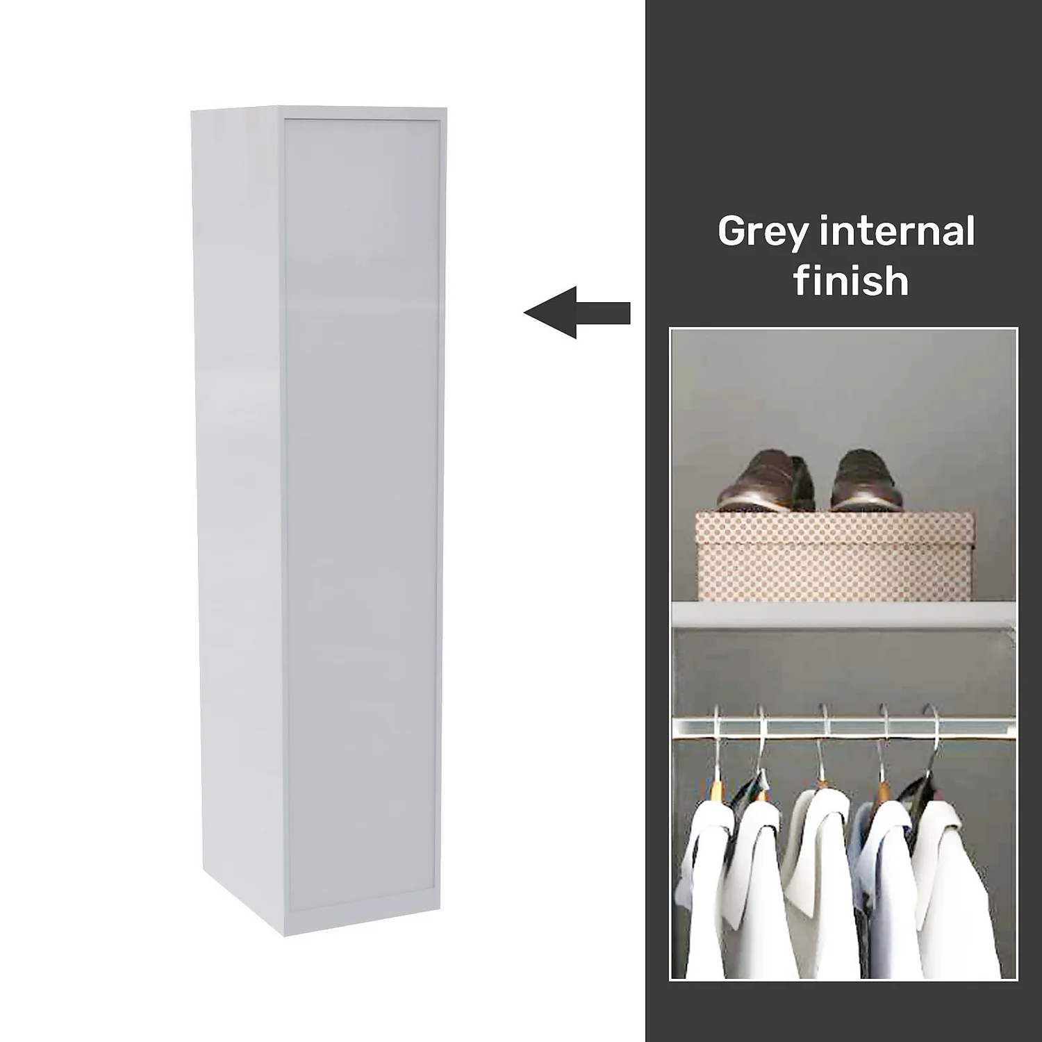 The House Beautiful range is exclusive to Homebase and offers a selection of different finishes and storage configurations to suit your needs. With a range of carcass colours and contrasting door designs, you can select the look to fit your bedroom aesthetic. The House Beautiful range now includes the fully fitted look with this combination pack which includes the wardrobe, end panels, plinth and cornice, meaning you can complete your bedroom with a luxury look. Coordinating chests of drawers are also available separately. This single wardrobe features a grey internal carcass which includes end panels, plinth and matching cornice all in a finish to match the beautiful luxe gloss white slab door. The wardrobe features premium soft close Blum hinges, a shelf and a hanging rail. You can customise your wardrobe with our additional internal storage options (available separately) including internal drawers, shelves, dividing shelves and extra hanging rails. Choose your handles from our range of both traditional and modern to suit your desired look.