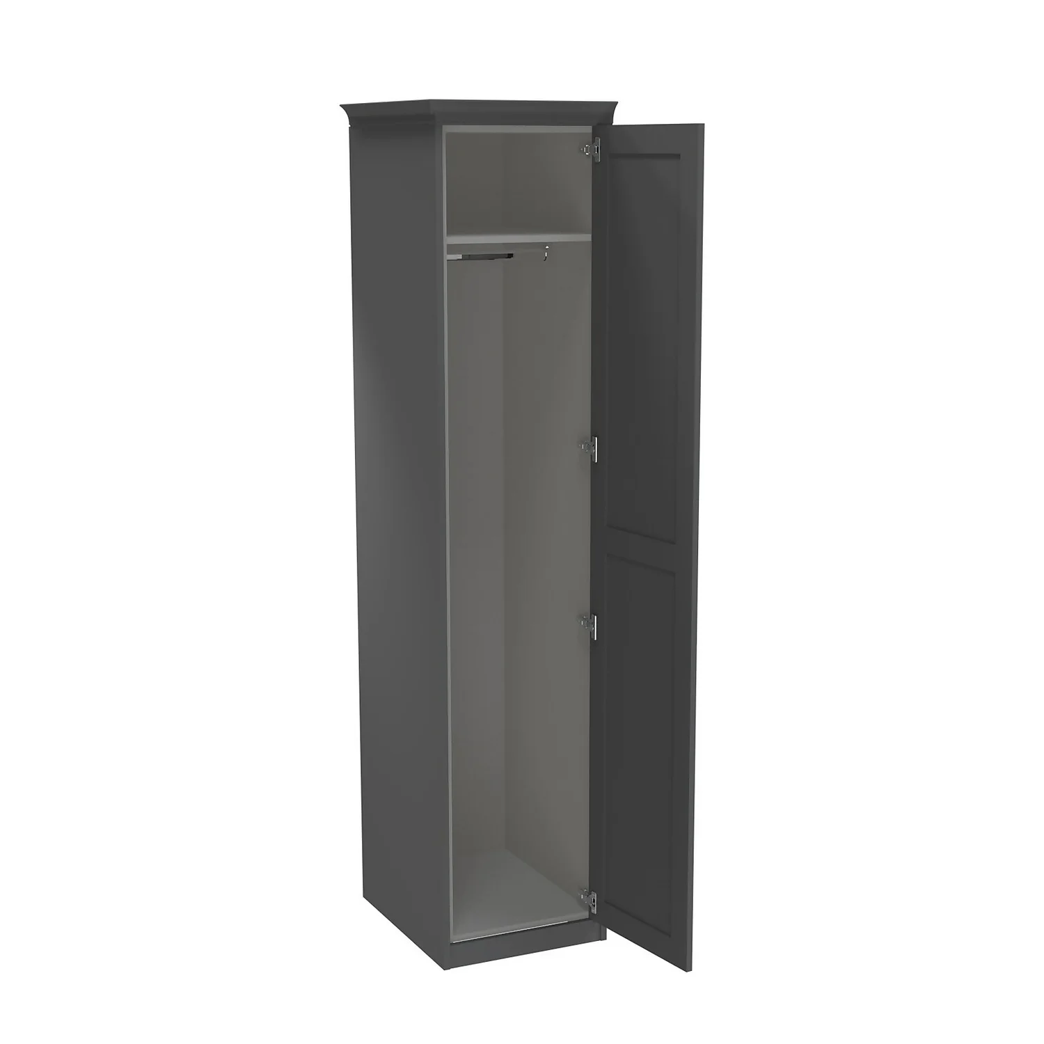 This single wardrobe features a grey internal carcass which includes end panels, plinth and matching cornice all in a finish to match the beautiful luxe matt carbon shaker door. The wardrobe features premium soft close Blum hinges, a shelf and a hanging rail. You can customise your wardrobe with our additional internal storage options (available separately) including internal drawers, shelves, dividing shelves and extra hanging rails. Choose your handles from our range of both traditional and modern to suit your desired look