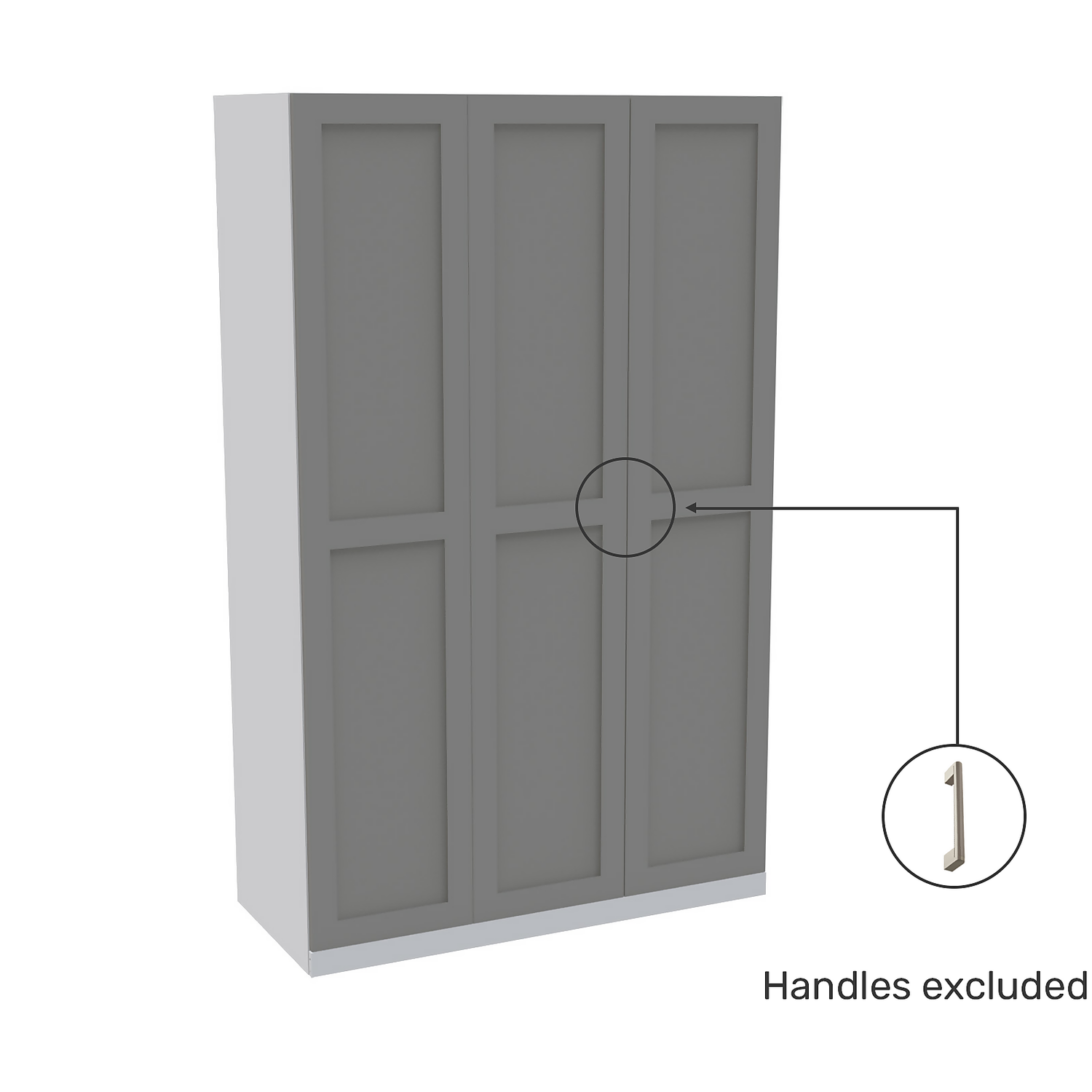 The House Beautiful range is exclusive to Homebase and offers a selection of different finishes and storage configurations to suit your needs. With a range of carcass colours and contrasting door designs, you can select the look to fit your bedroom aesthetic. This triple wardrobe (one double and one single) features a white carcass and beautiful shaker doors finished in a luxurious matt grey. The wardrobe features premium soft close clip-on Blum hinges, two shelves and two hanging rails. You can customise your wardrobe with our additional internal storage options (available separately) including internal drawers, shelves, dividing shelves and extra hanging rails. Choose your handles from our range of both traditional and modern to suit your desired look.